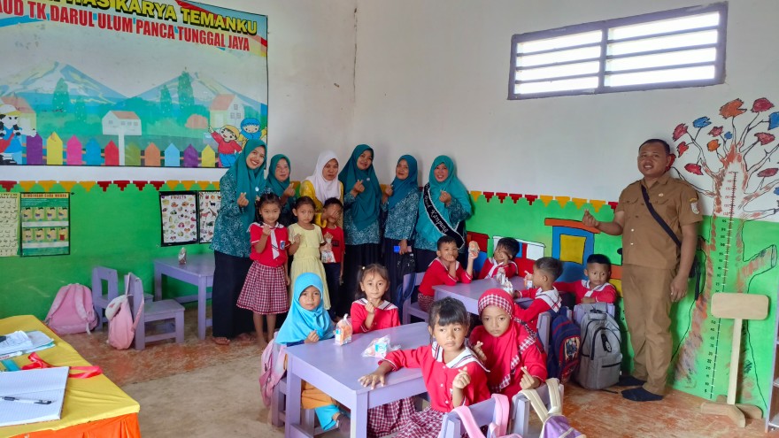 Dalam kesempatan tersebut, Bunda PAUD didampingi perangkat kampung mengunjungi satu per satu TK yang ada di Panca Tunggal Jaya. Selain berdialog dengan para tenaga pendidik mengenai proses belajar mengajar dan perkembangan anak, kegiatan juga diisi dengan pembagian makanan tambahan bagi seluruh siswa TK.