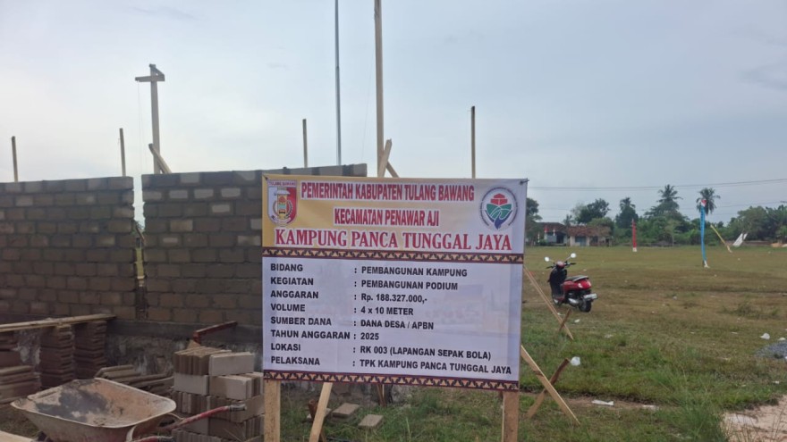 Kampung Panca Tunggal Jaya, Kecamatan Penawar Aji — Pembangunan podium sepak bola di Lapangan Kampung Panca Tunggal Jaya kini telah selesai dikerjakan. Proyek yang menelan anggaran sebesar Rp188.327.000 ini diharapkan dapat menjadi kebanggaan warga sekaligus mendorong semangat olahraga, khususnya sepak bola, di kalangan generasi muda.