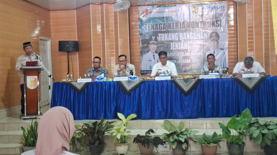 Asisten II Bidang Perekonomian dan Pembangunan, Pahada Hidayat, secara resmi membuka kegiatan Pelatihan Tenaga Kerja Konstruksi Tukang Bangunan Jenjang 2 yang berlangsung di Aula Balai Kampung Pancatunggal Jaya, Kecamatan Penawar Aji, Kabupaten Tulang Bawang, Lampung, Rabu (29/10/2025).